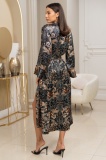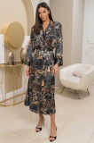 Длинный запашной халат Mia-Amore с застёжкой на пуговицы и английским воротником выполнен из принтованного смесового шёлка. Манжеты рукавов, воротник, борт халата и пояс украшены золотистым кантом. Халат запахивается на пояс с золотыми декоративными кисточками, в боковых швах есть карманы.