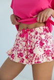 Яркая необычная пижама Madalena с футболкой и шортиками свободного силуэта. Выполнена из высококачественного хлопкового полотна. Шорты оформлены рюшами, декорированы атласным бантиком и контрастным цветочным принтом.
